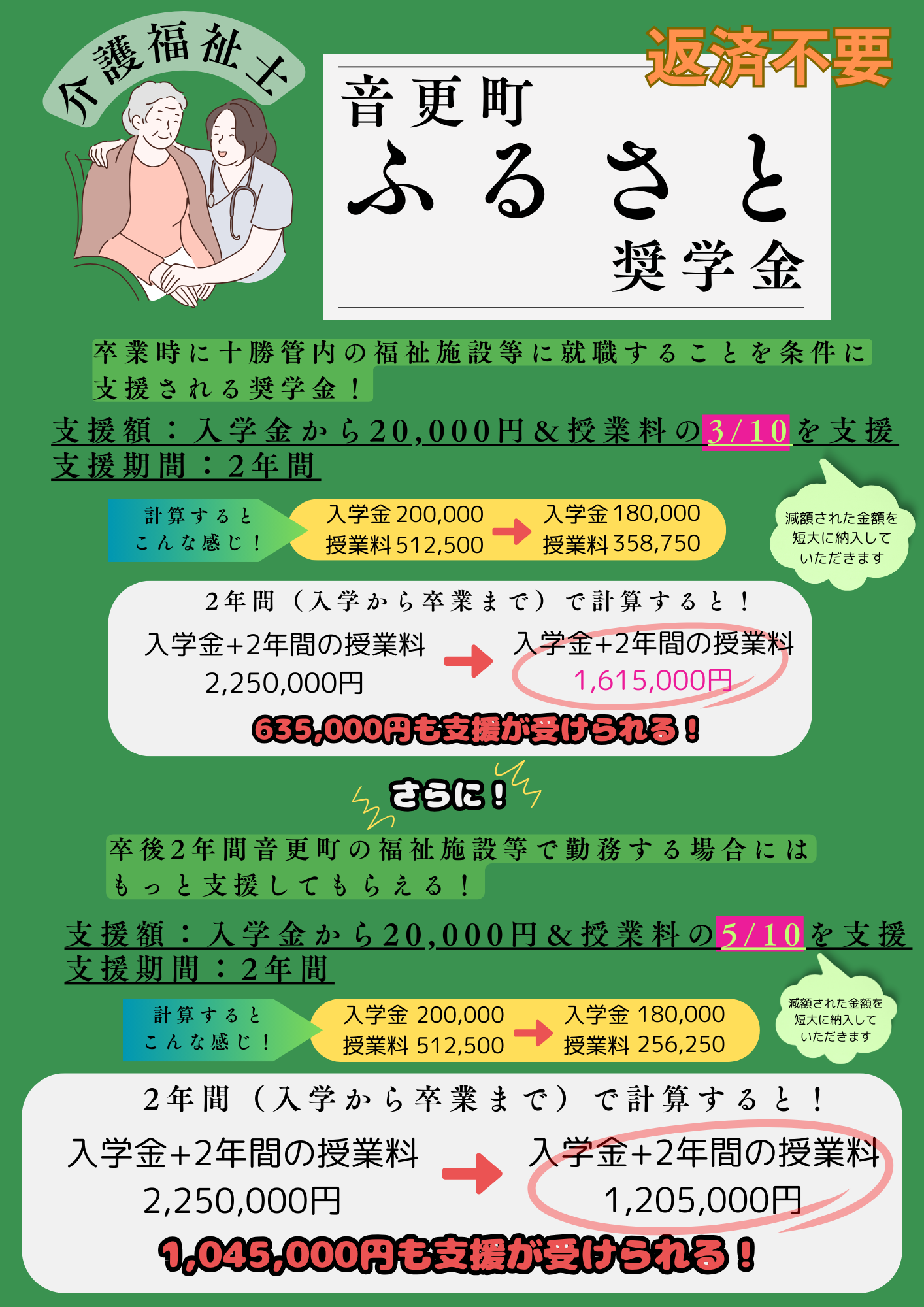 社会福祉科介護福祉専攻へ進学する学生に対し、「音更町・帯広大谷短期大学ふるさと介護福祉士育成支援事業」として、入学金及び学費の支援を行う。