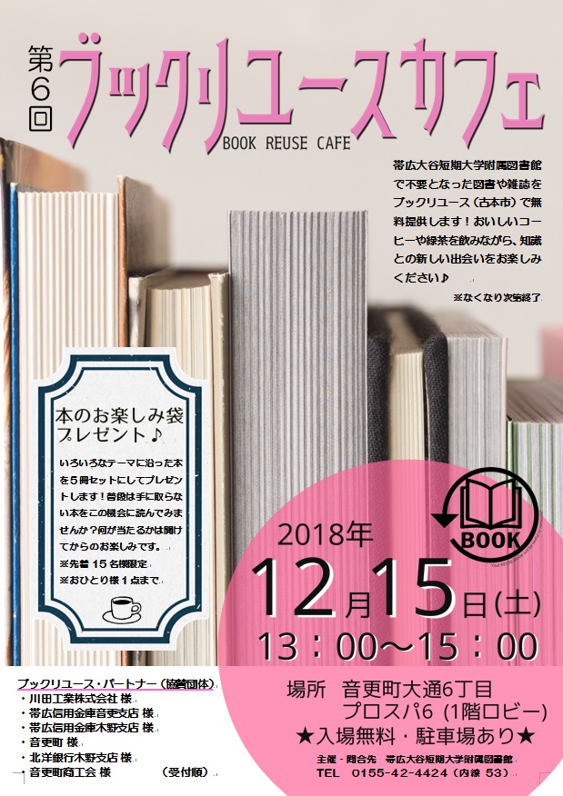 帯広大谷短期大学附属図書館で不要となった図書や雑誌をブックリユース(古本市)で無料提供します。小説、漫画、雑誌、文庫など多数ご用意!コーヒーや緑茶を飲みながら、知識との新しい出会いを楽しみませんか♪