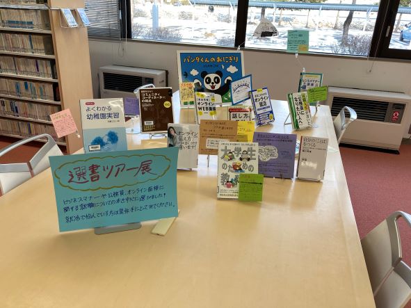 今回の選書ツアーでは『就職に役立ちそうな本』を中心に選びました。面接対策や会話術、ビジネスマナーなど、就職活動だけではなく卒業後も役立ちそうな本も選んでいます。特設コーナーに設置している学生の作ったPOPと合わせてご覧ください。