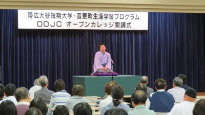 今年の開講式記念講演は落語立川流立川談吉さんによる「ふるさとらくご」を行いました。最初は、帯広出身の談吉さんの素顔が垣間見えるフリートーク。その後の小噺は「~それなら葛根湯を飲みなさい」というフレーズが何度も出てくる「葛根湯医者」等や落語は「田能久」等で、会場が120名の来場者の笑い声でいっぱいになりました。
