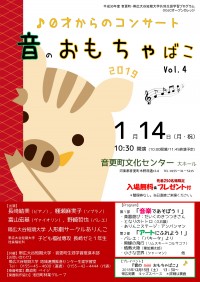 第4回目となる『0才からのコンサート 音のおもちゃばこ』。今年はさらにパワーアップします! 新しい年に、親子で気軽に芸術に触れてみませんか? たくさんの皆さまのご来場をお待ちしています! と き 平成31年 1月14日(月祝)