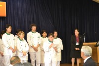 また、試食後にはレシピ本を監修した北村助教がスライドを用いて「レシピ本完成までの道のり」の話しがありました。最後に、調理を担当した生活科学科 栄養士課程の学生紹介よりお礼の挨拶を行いました。