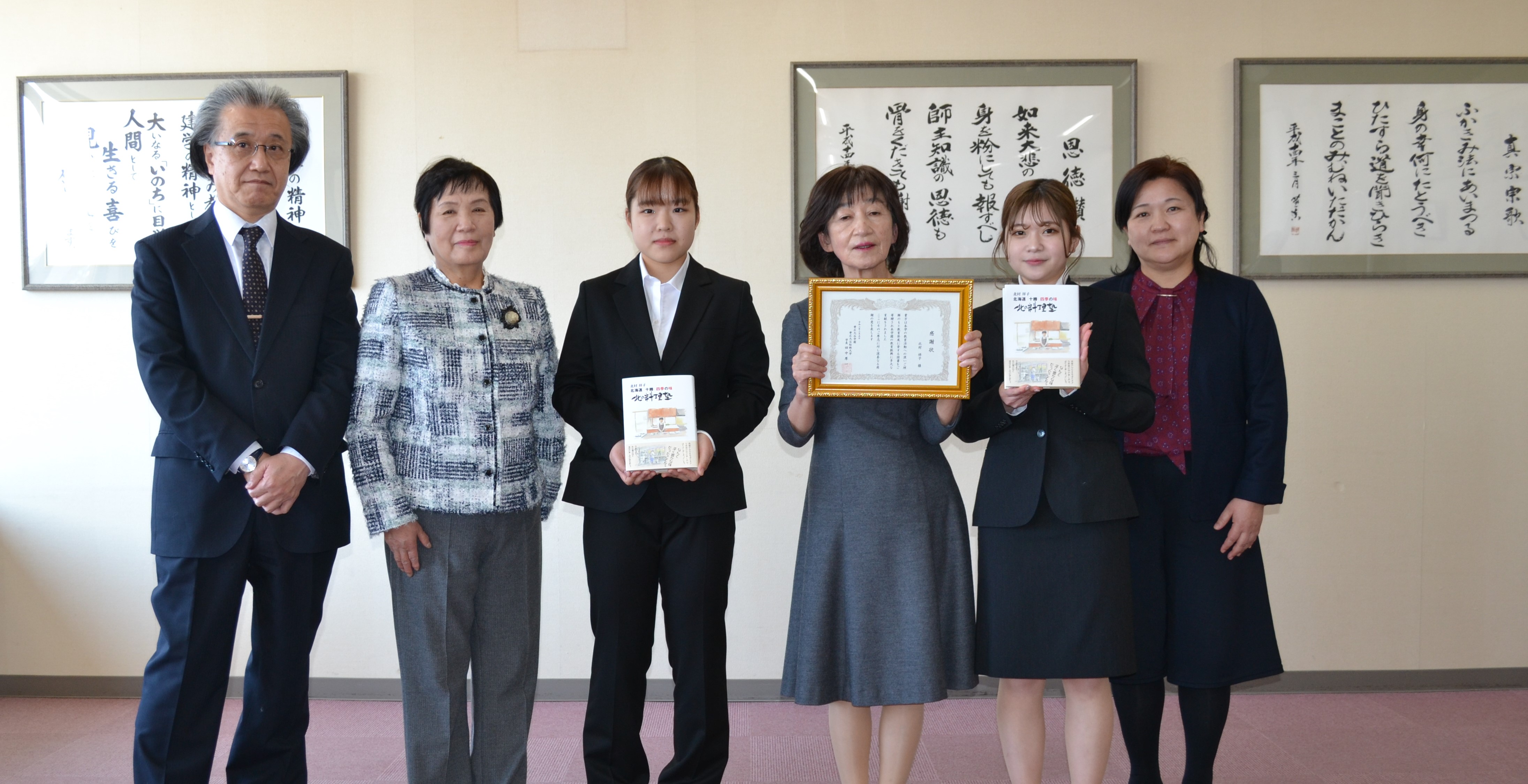 音更町在住料理研究家 北村祥子様から、自主出版された「北海道 十勝 四季の味 北の料理塾」 を生活科学科栄養士課程在学生にご寄贈いただきました。 北村祥子様は、本学卒業生であり、非常勤講師もお勤めいただき、多大なる貢献をいただいている 方々のお一人です。 北村様からのご期待に添える様、学生並びに本学関係者も<地域と共にさまざまな課題に向き合い> なくてはならない短期大学として今後も精進してまいります。