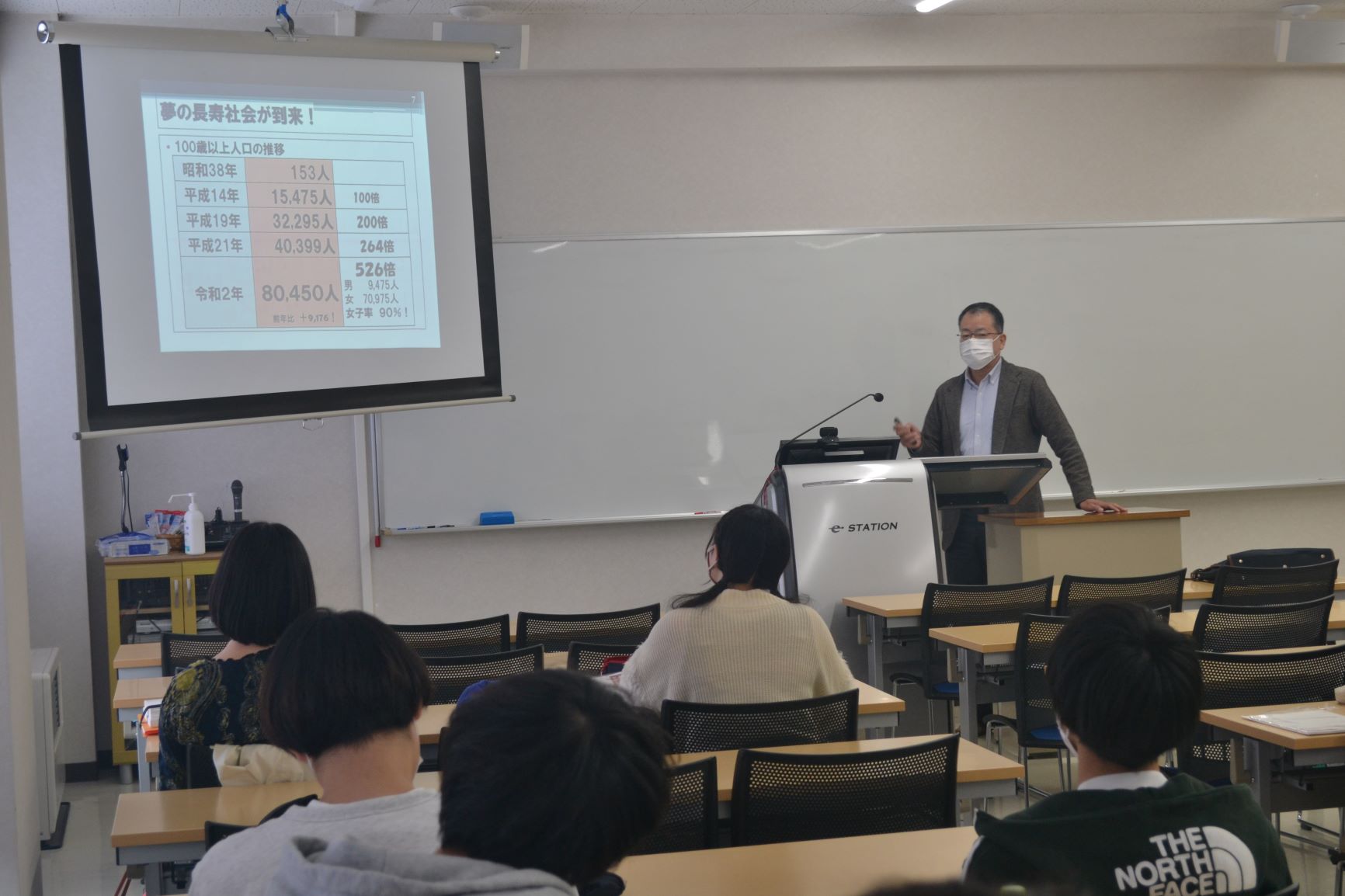 この日は、特別養護老人ホームしゃくなげ荘(鹿追町)の山本進施設長にお越しいただき、 日本における人間の死亡原因と平均寿命の変遷や世界各国の介護事情と日本の介護の在り方について理解を深めるとともに、 施設におけるターミナルケア(終末期の介護)の実際について学習しました。