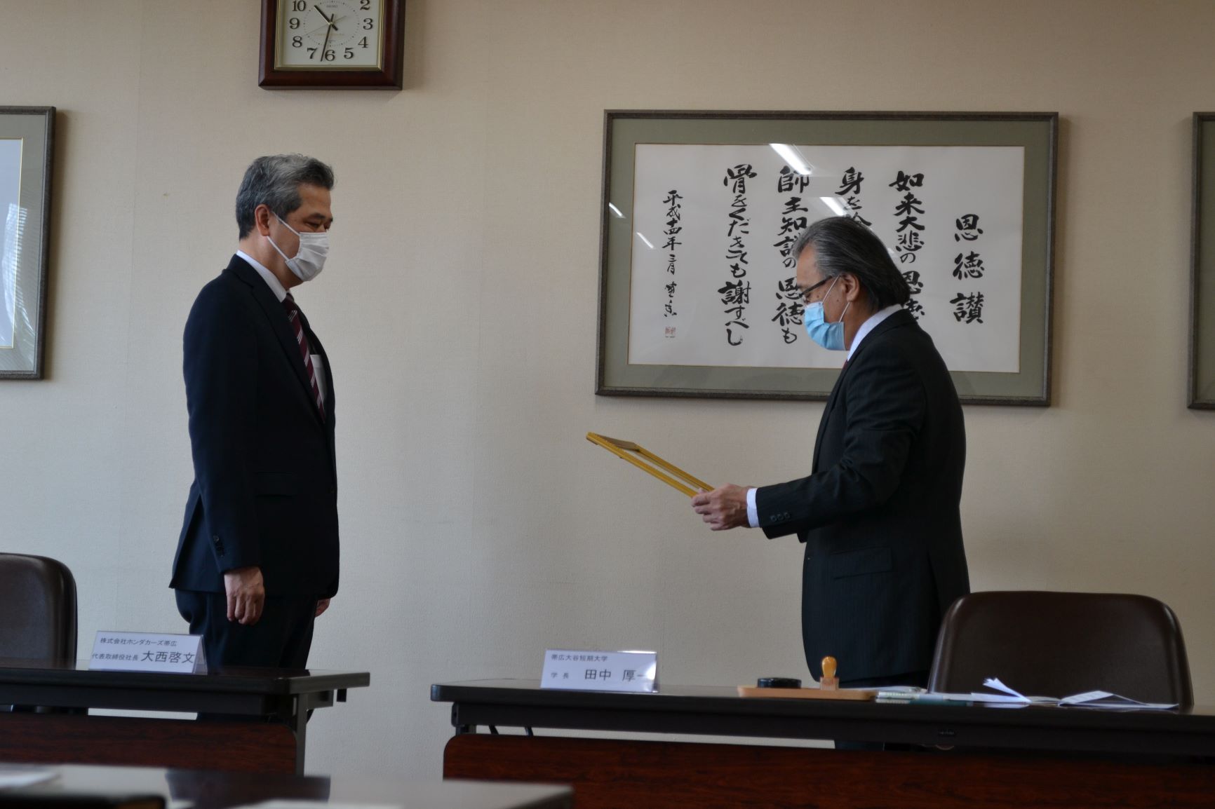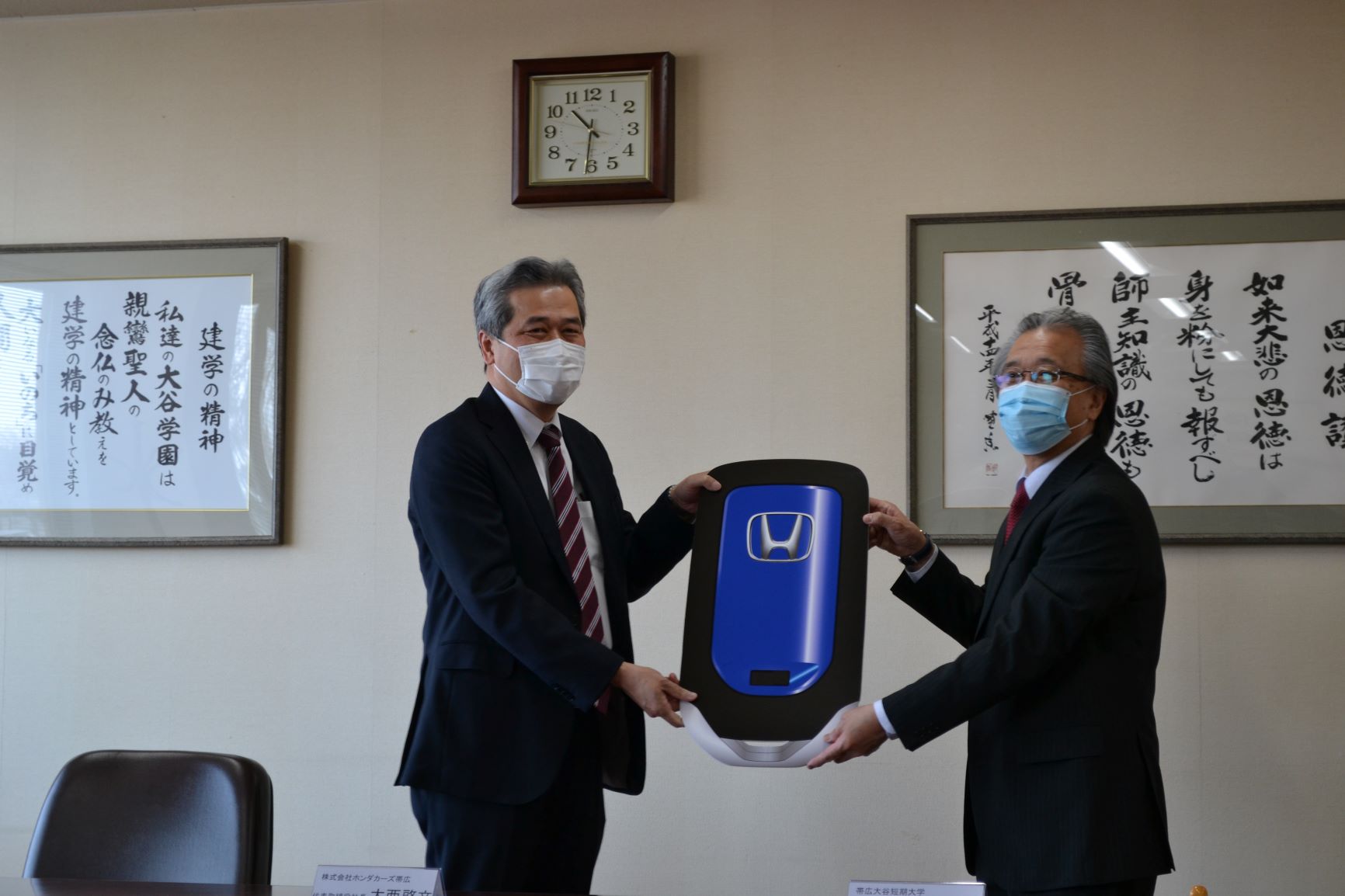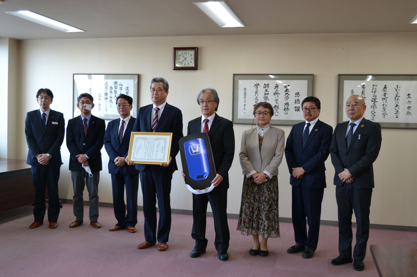 2021年4月20日(火)10:30~本学会議室におきまして、株式会社ホンダカーズ帯広「福祉車両」に関する寄付(貸与)の調印式並びに納車式が行われました。 当日は晴天の中、株式会社ホンダカーズ帯広 代表取締役社長 大西様をはじめ3名の方々がお越しいただき、車両寄付(貸与)に関する調印式を行い、本学 田中学長より感謝状の贈呈、その後納車式を行い「福祉車両」による車椅子でのデモンストレーションを行い、終了いたしました。 今後も、地域においての教育及び福祉活動に寄与する地域密着型の教育機関として、さまざまな課題と向き合いその役割を果たしていくよう努力いたします。