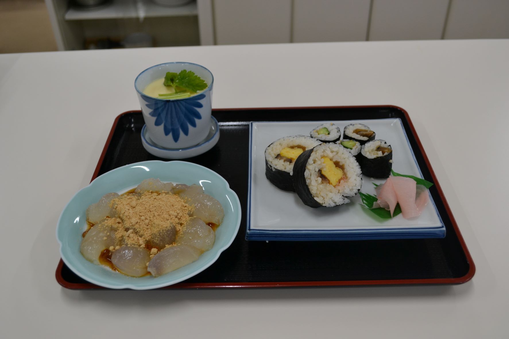 この日は「和食」がテーマで「巻き寿司、茶わん蒸し、わらび餅」を調理しました。