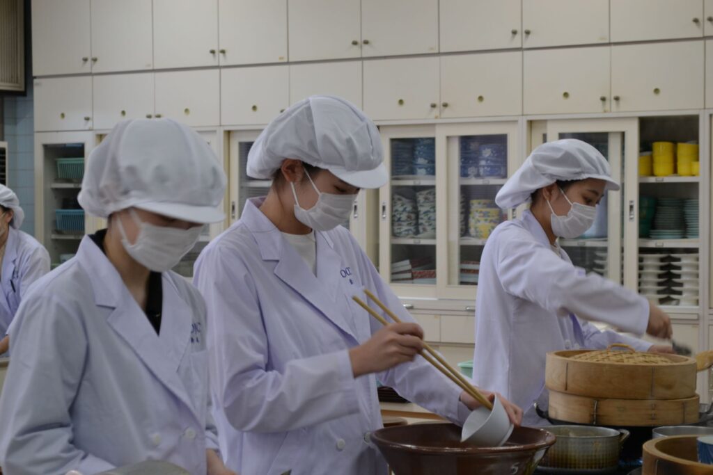 講義時間内に調理・配膳を行うべく、グループ内での共同作業では、 コミュニケーションを図りながら連携し、調理の基礎を学びました。