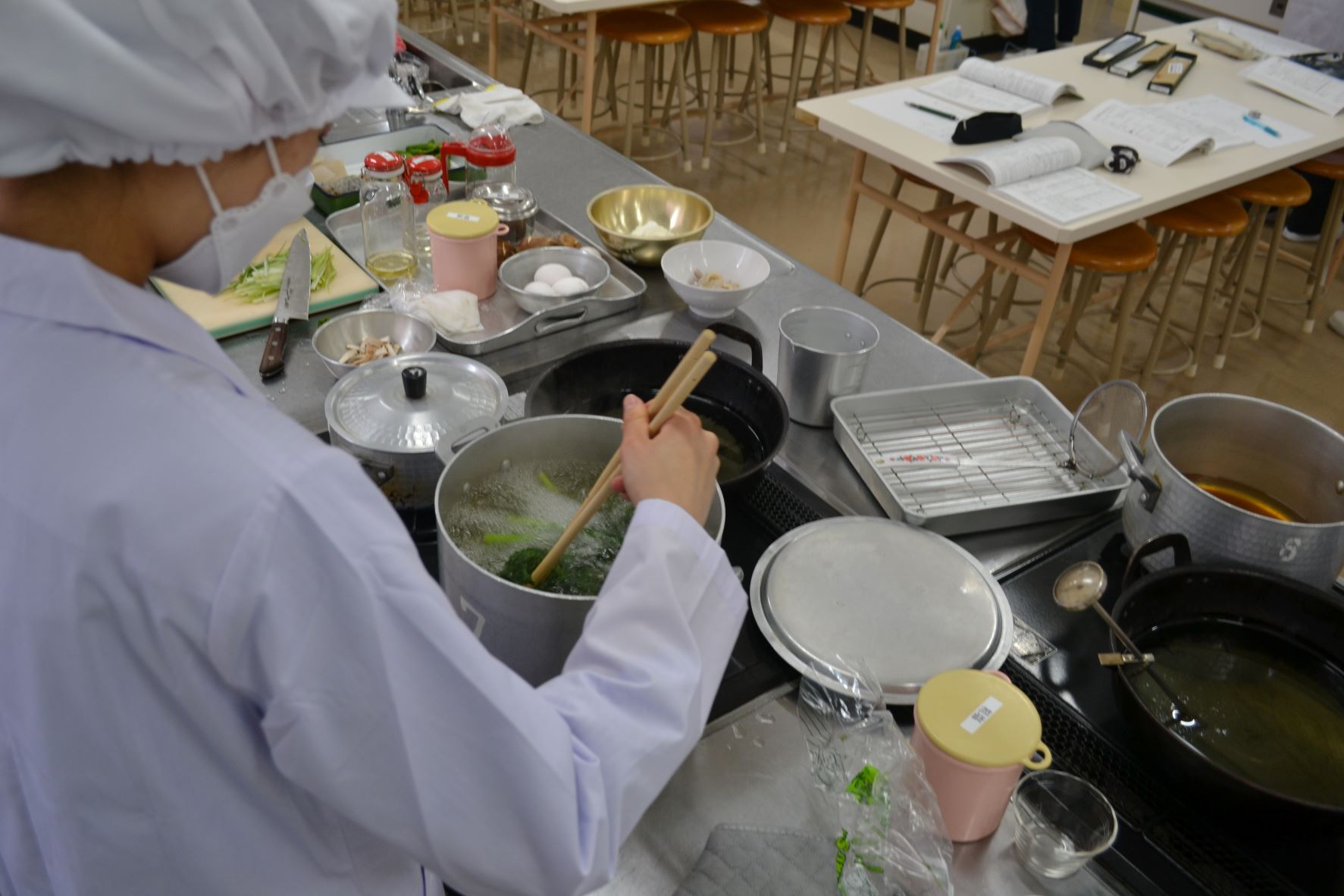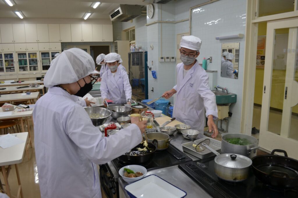 講義時間内に調理・配膳を行うべく、グループ内での共同作業では、 コミュニケーションを図りながら連携し、調理の基礎を学びました。