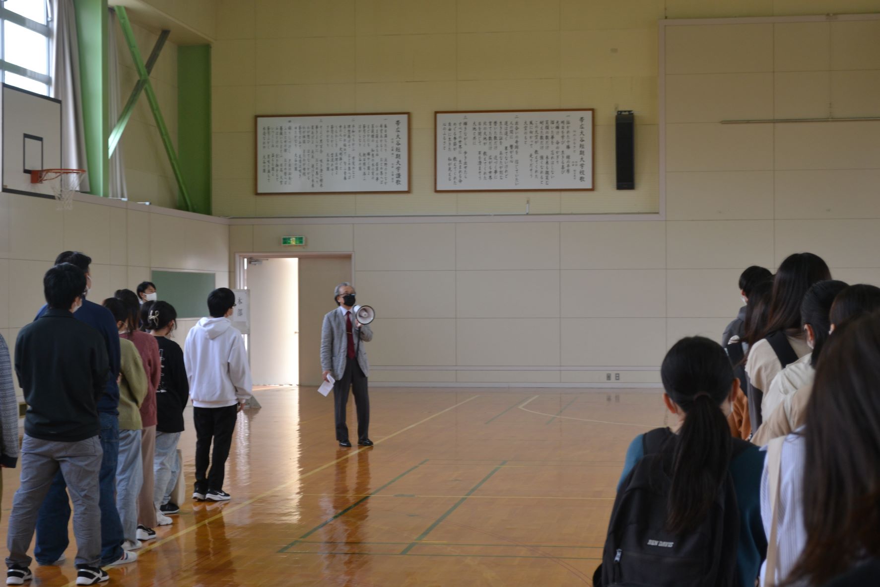 フジ防災㈱様 立ち合いのもと、 教職員、学生ともに避難経路を確認しながら緊張感を持って真剣に訓練に取り組みました。