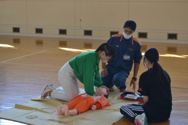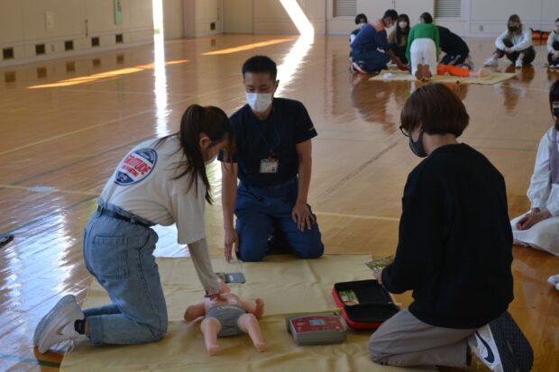 この日は、音更町消防署職員にご協力いただき、子どもの命を守るための応急処置法や技術について学びました。 小児・乳児、新生児についての心肺蘇生法やAEDの使用方法を実践することで、心肺蘇生の目的と重要性や救命処置の手順を学習しました。