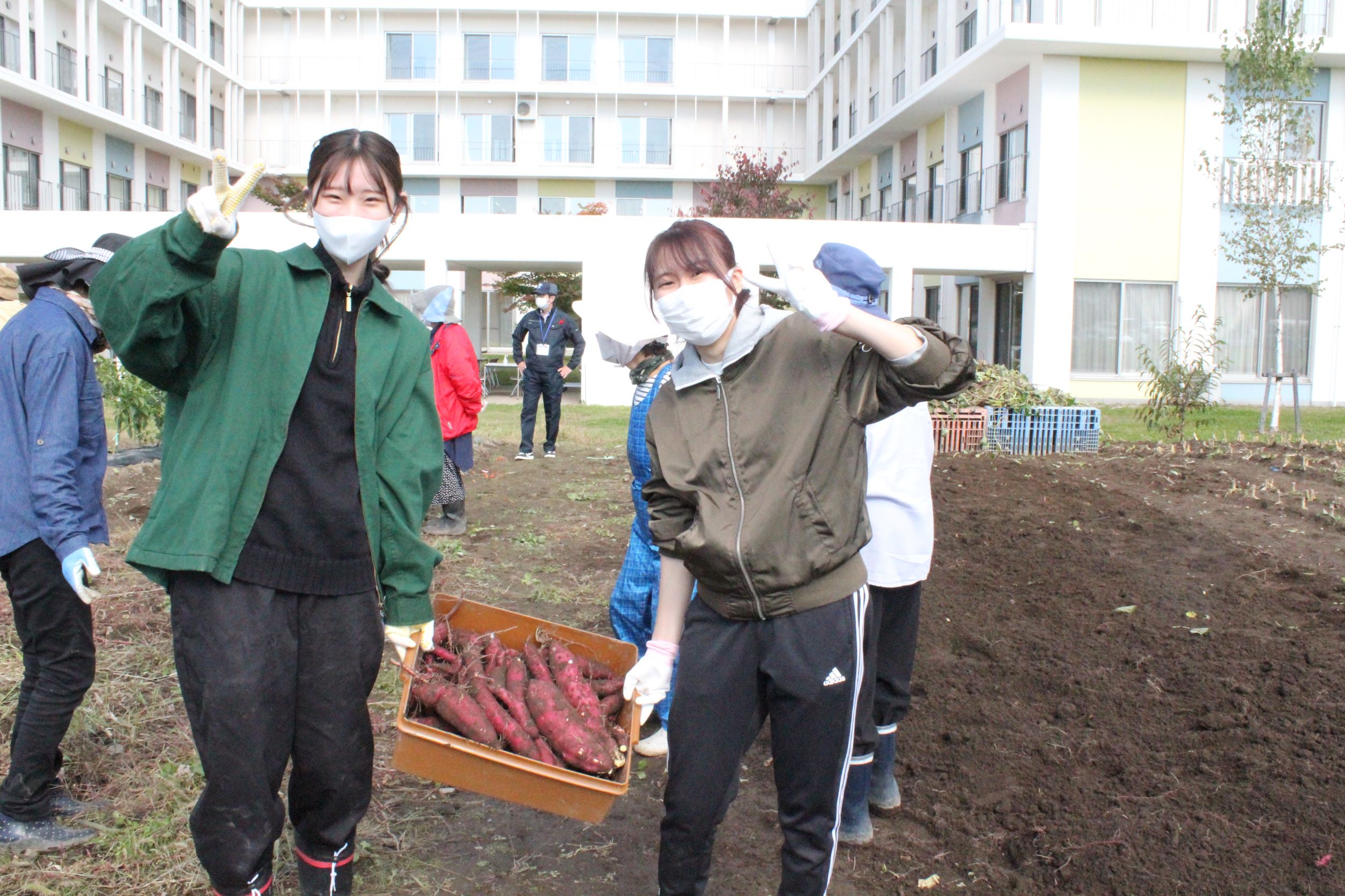10月13日(木)、社会福祉科 介護福祉専攻の学生が、音更町社会福祉協議会主催の地域農園「話花」(音更町柏寿協会敷地内)の収穫作業に参加しました。さつまいもや大根などの収穫、かぼちゃの選別など、地域の皆さんとの交流を深めながらお手伝いさせていただきました。 また、その後に行われた認知症カフェ「花話」では、参加された皆さんとお茶を飲みながら認知症の理解を深める映像を鑑賞しました。地域における認知症の啓発活動の実際を学ぶ機会となりました。