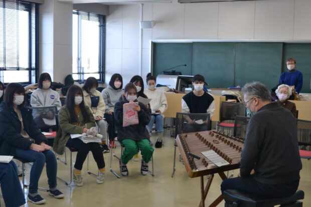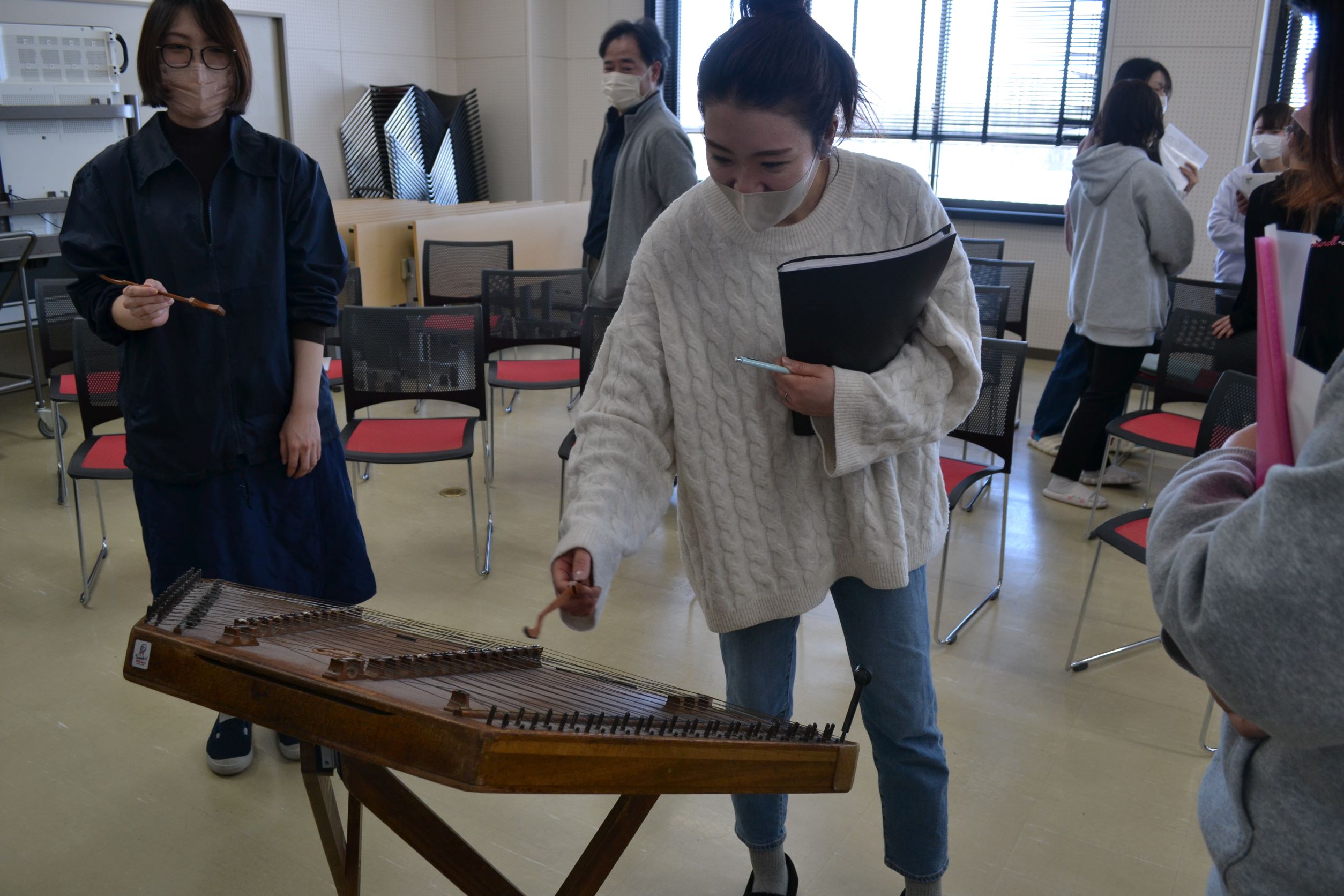 1月19日(木)、子ども福祉専攻の社会福祉学特別演習Ⅱ「木育音楽ゼミ」の授業内でハンマーダルシマー奏者「小松崎健」氏によるミニコンサートを行いました。 ヤマハのピアノ部品の端材で、ピアノの祖先といわれるハンマーダルシマーを制作するという授業内容に関連して、本物のハンマーダルシマーのプロによる演奏を生で聴いたり、体験したりしました。