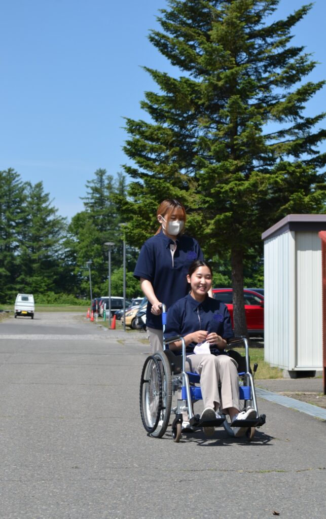 この日は、学校敷地内で車いす介助を学びました。 車いす移動介助の基本と心構え(利用前の安全確認の手法、点検ポイント)を学び、 乗車や移動時に体調の変化を確認する声掛けや、段差の上り方などを実践的に学びました。