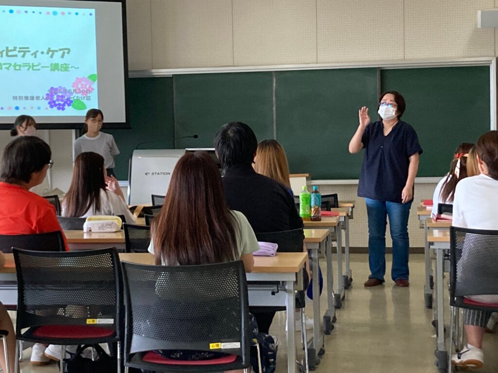 この講義では、介護を必要する方の生活の活性化を目指したさまざまなケアを学びます。 この日は、鹿追の特別養護老人ホームから職員の方をお招きし、アロママッサージの方法を学びました。