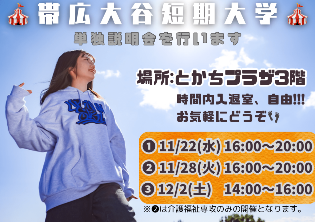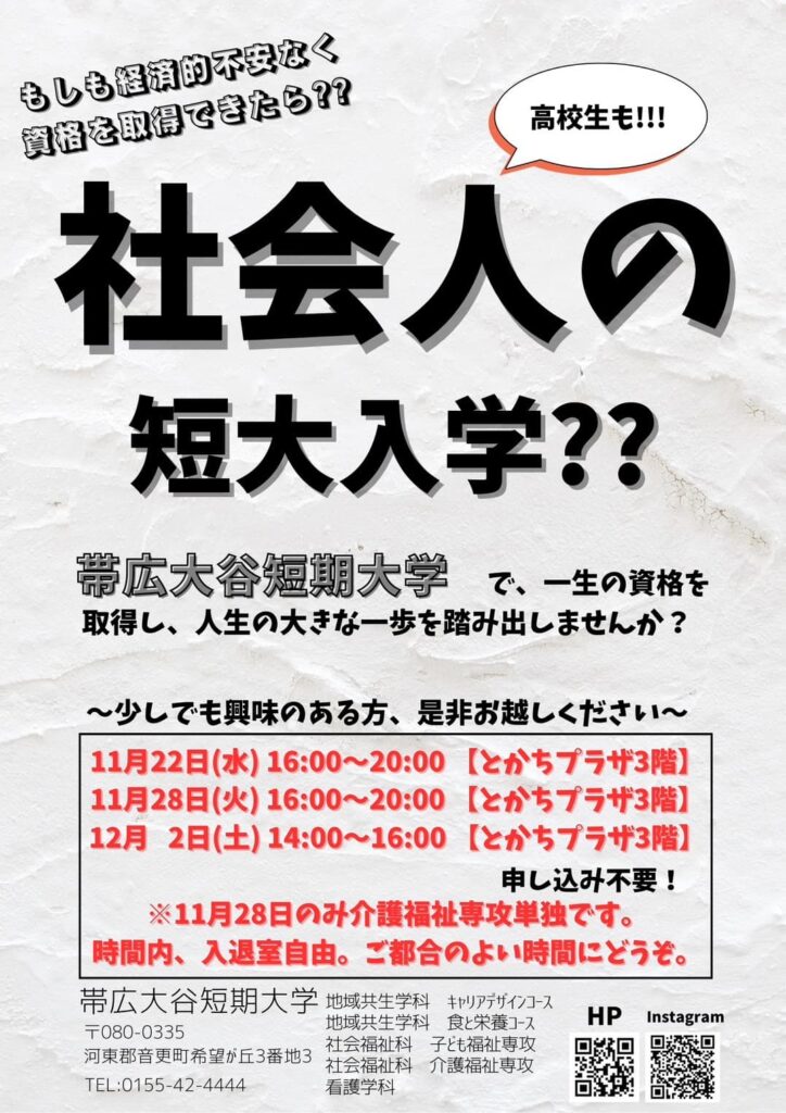 . 〜場所〜 とかちプラザ3階 . 事前申し込みは不要です。 ご都合のいい日程でご自由にご参加ください。 時間内、入退室自由です。 . 高校生の方も社会人の方も 少しでも帯広大谷短大に興味のある方は是非ともお越しください。 . お待ちしております!