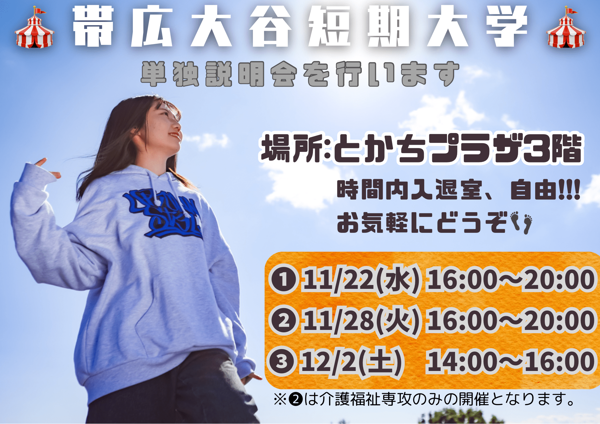 〜開催日〜 11/22(水) 16:00〜20:00 ←全学科 11/28(火)16:00〜20:00 ←介護のみ 12/2 (土)14:00〜16:00 ←全学科