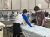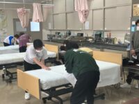 利用者の安眠をうながす技術の一つにベッドメイキングがあります。 ベッドは利用者にとって休息・睡眠の場であるとともに様々な生活が営まれる場でもあります。 寝具やベッド周辺に配慮し、心地よい環境を整備できるよう学びを深めました。