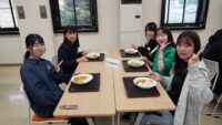 その後、学生を交えた昼食会が行われ、地域共生学科 食と栄養コース2年生が「給食管理実習Ⅰ」で調理した玉ねぎを丁寧に煮込んだ特製カレーライスを食べていただきました。