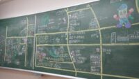 調査後、施設の利用に関する情報や調査で得た情報を報告して全員で共有した後、黒板全面を使って短大周辺のMAPを作成しました。
