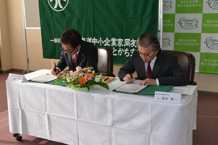 2016(平成28)年3月23日(水)、本学におきまして一般社団法人北海道中小企業家同友会とかち支部と本学との包括連携に関する協定の調印式が行われました。