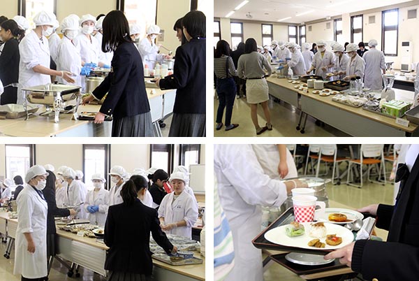 レシピ本の「ライフステージ」、「地産地消」の中から17品を栄養士課程1年生が調理し提供しました。