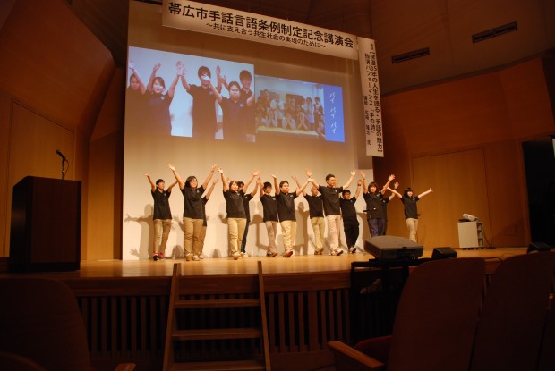 平成28年4月1日 帯広市手話言語条例が施行されました。条例制定を記念した講演会が7月30日(土)12時30分よりとかちプラザレインボーホールで開催され、本学の手話サークル「つなぐ手」が出演。手話コーラスによる2曲を披露し会場を沸かせました。