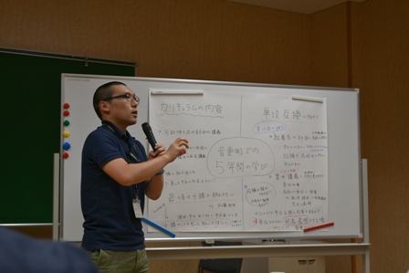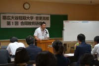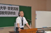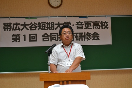 2016(平成28)年8月26日(金)、寺山憲二音更町長様と渡辺仁音更町企画財政部企画課長様をお招きし、教職員を対象とした教育研修会を北海道音更高等学校と合同で実施しました。この研修会は昨年5月に締結した教育連携協定に基づく取り組みの一環です。約40名の参加があり、寺山町長ご挨拶から始まり、渡辺課長から「音更町が目指す方向や施策について」報告がなされました。さらに、藤井勝弘音更高等学校長より「単位互換や部活動の交流」について提案がなされ、岡庭義行教育・研究担当副学長より「本学の取組」について報告がなされました。