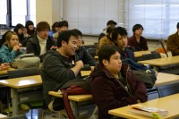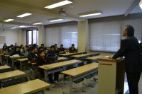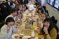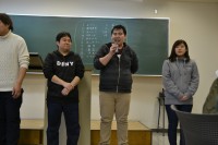 講義室を移動し行われた交流会では、新・旧学生会執行委員の挨拶、各サークルより活動内容等の紹介がなされ、「ピザ」を食べながら交流がなされ、スライドショーを観ながら1年間の学内行事を振り返り、親睦を深めました。