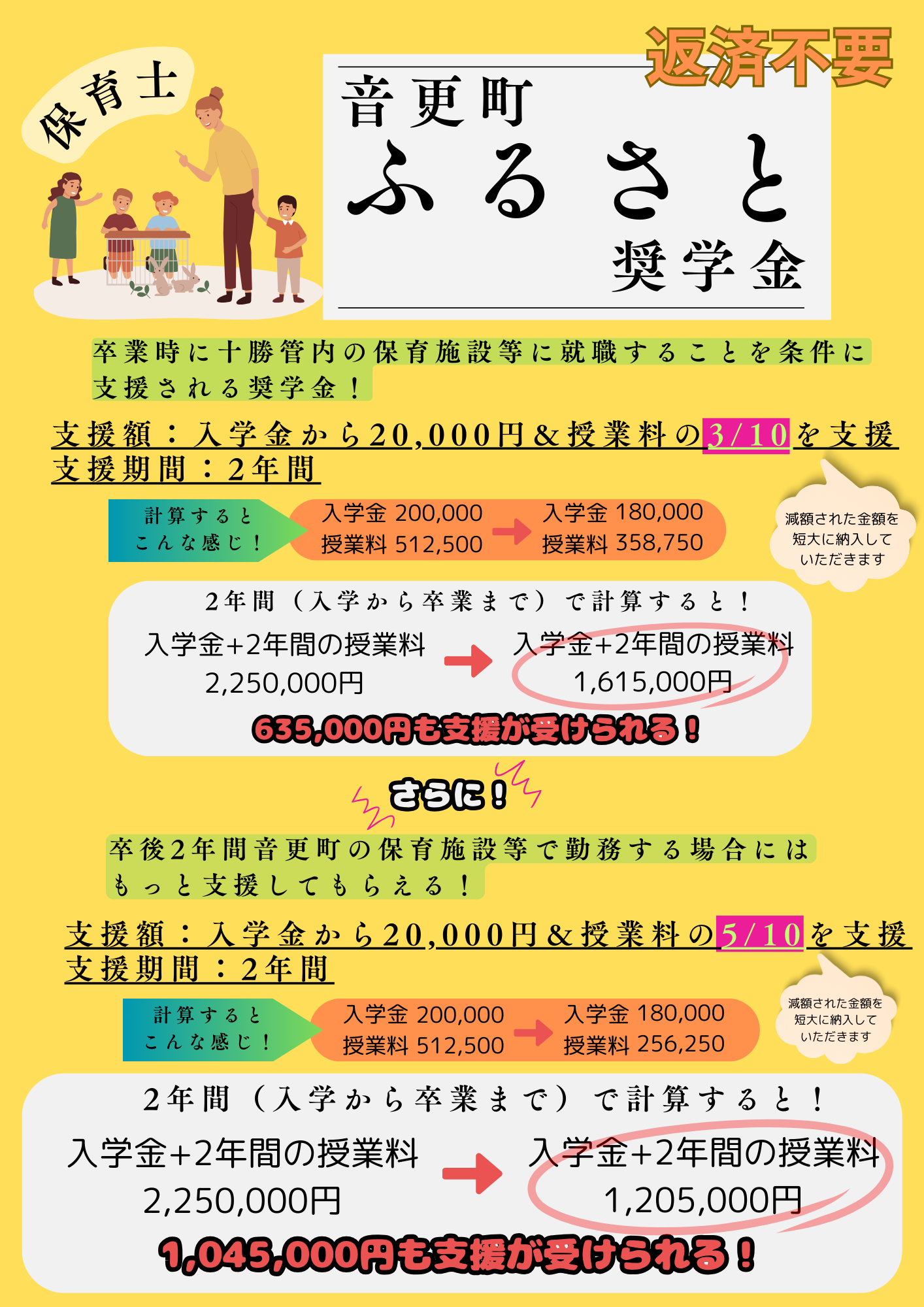 社会福祉科子ども福祉専攻へ進学する学生に対し、「音更町・帯広大谷短期大学ふるさと保育士育成支援事業」として、入学金及び学費の支援を行う。
