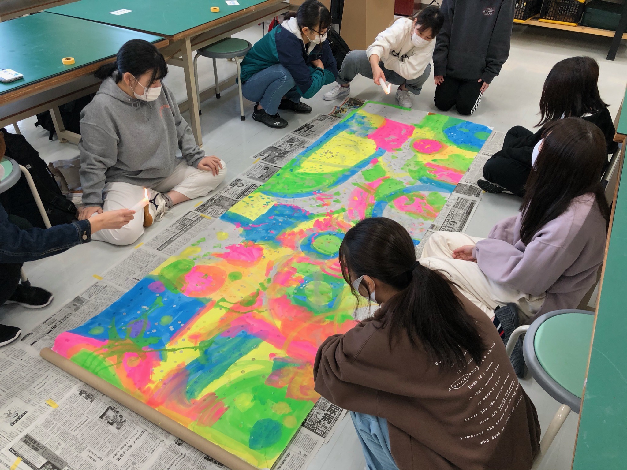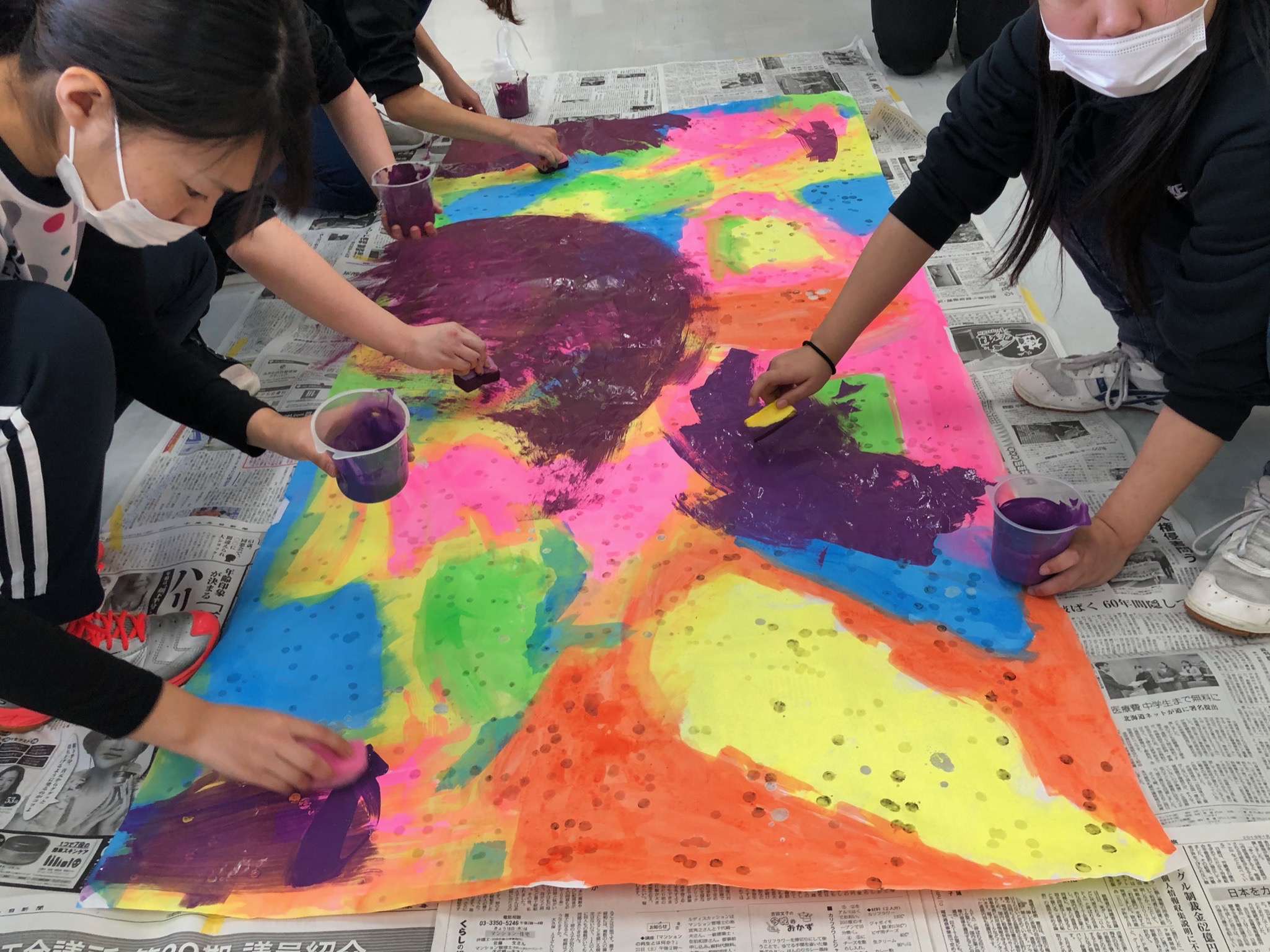 社会福祉科 子ども福祉専攻「子どもと造形」 社会福祉科 子ども福祉専攻「子どもと造形」の授業では共同で大きな作品を作りました。 ゼミでもグループで手形アート作品を作ったり、一緒に制作する楽しさを噛みしめながら作業をしているところです。